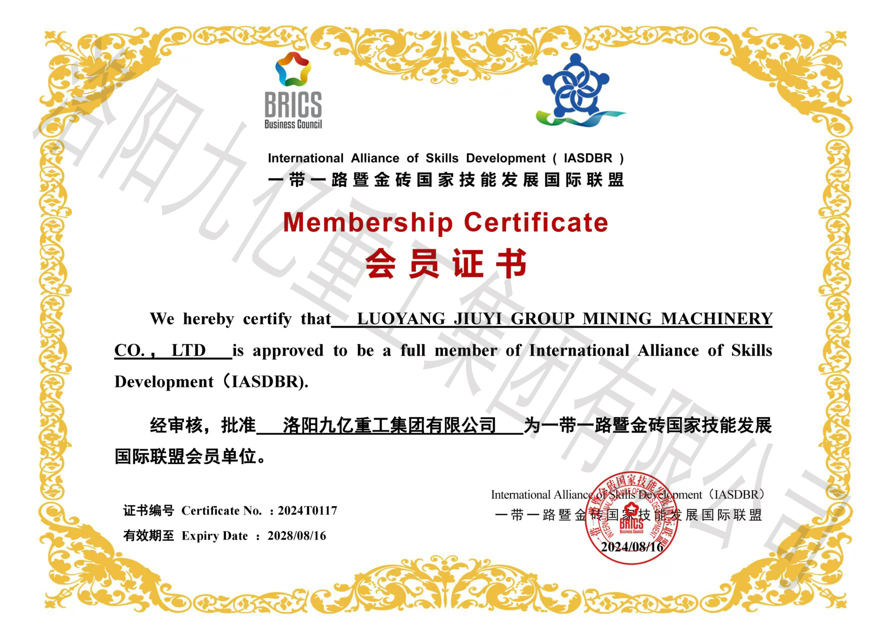 一帶一路暨金磚國(guó)家技能發(fā)展國(guó)際聯(lián)盟會(huì)員證書